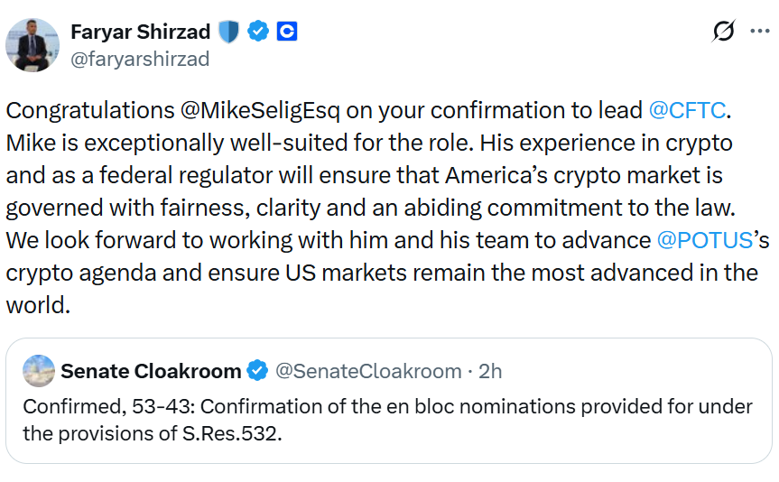 Faryar Shirzad, the chief policy officer at crypto exchange Coinbase, said in an X post that Seligโs โexperience in crypto and as a federal regulator will ensure that Americaโs crypto market is governed with fairness, clarity and an abiding commitment to the law.โ