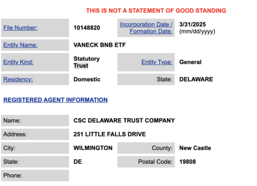 VanEck BNB ETF trust registration in Delaware. Source: Delaware.gov