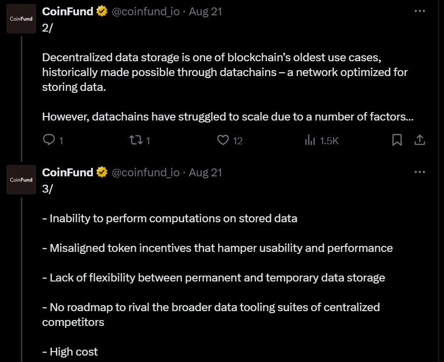 CoinFund called decentralized data storage one of the blockchain industry’s oldest promises, but noted that datachains have long struggled to scale. Challenges include limits on how much data can be stored, misaligned economic incentives and the lack of flexibility between permanent and temporary storage, the firm said.