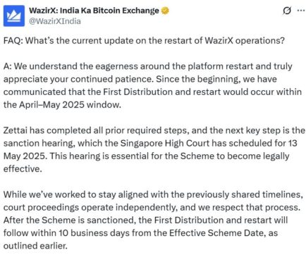 WazirX confirms restart on track as it awaits sanction hearing in May