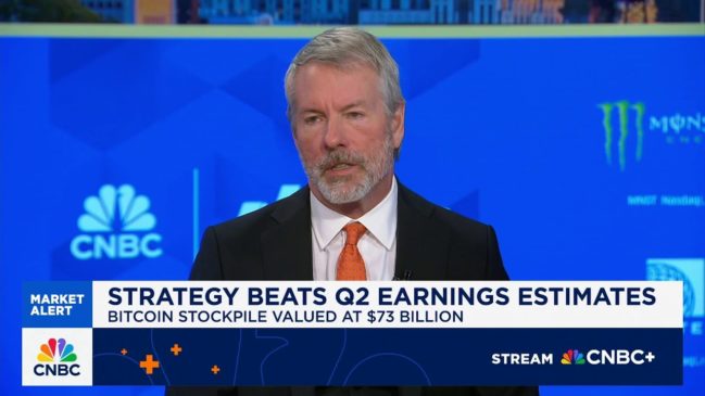 Michael Saylor, Strategy executive chairman, joins ‘Squawk Box’ to discuss the company’s quarterly earnings results, the company’s bitcoin stockpile, state of crypto, and more.