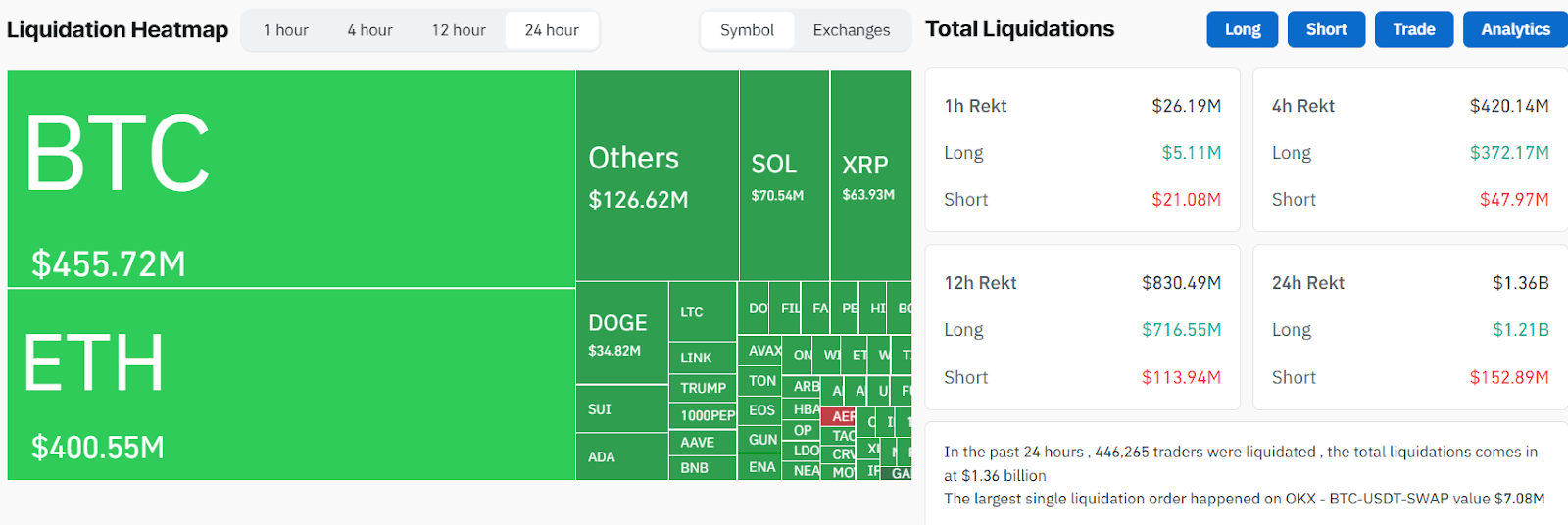 According to data from CoinGlass, more than 446,000 positions have been liquidated in the past 24 hours, with total losses surpassing $1.36 billion. That includes $1.21 billion in long positions and $152 million in shorts.
