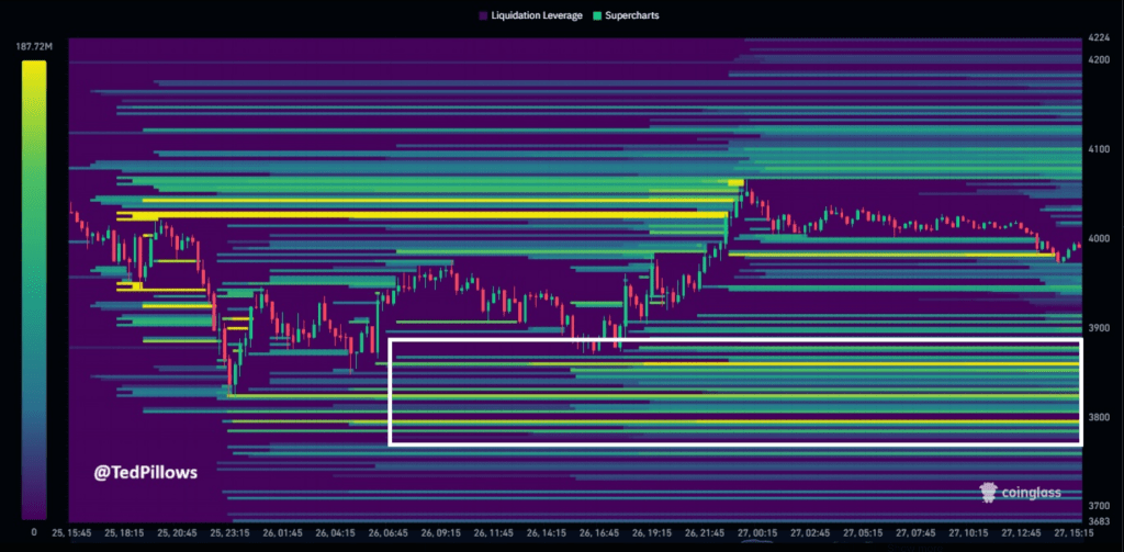 Crypto analyst Ted Pillows has warned that the $3,700 to $3,800 zone could face heavy pressure. Reports note that if ETH falls below $3,700, many margin positions could be wiped out and spark forced selling that pushes prices lower.