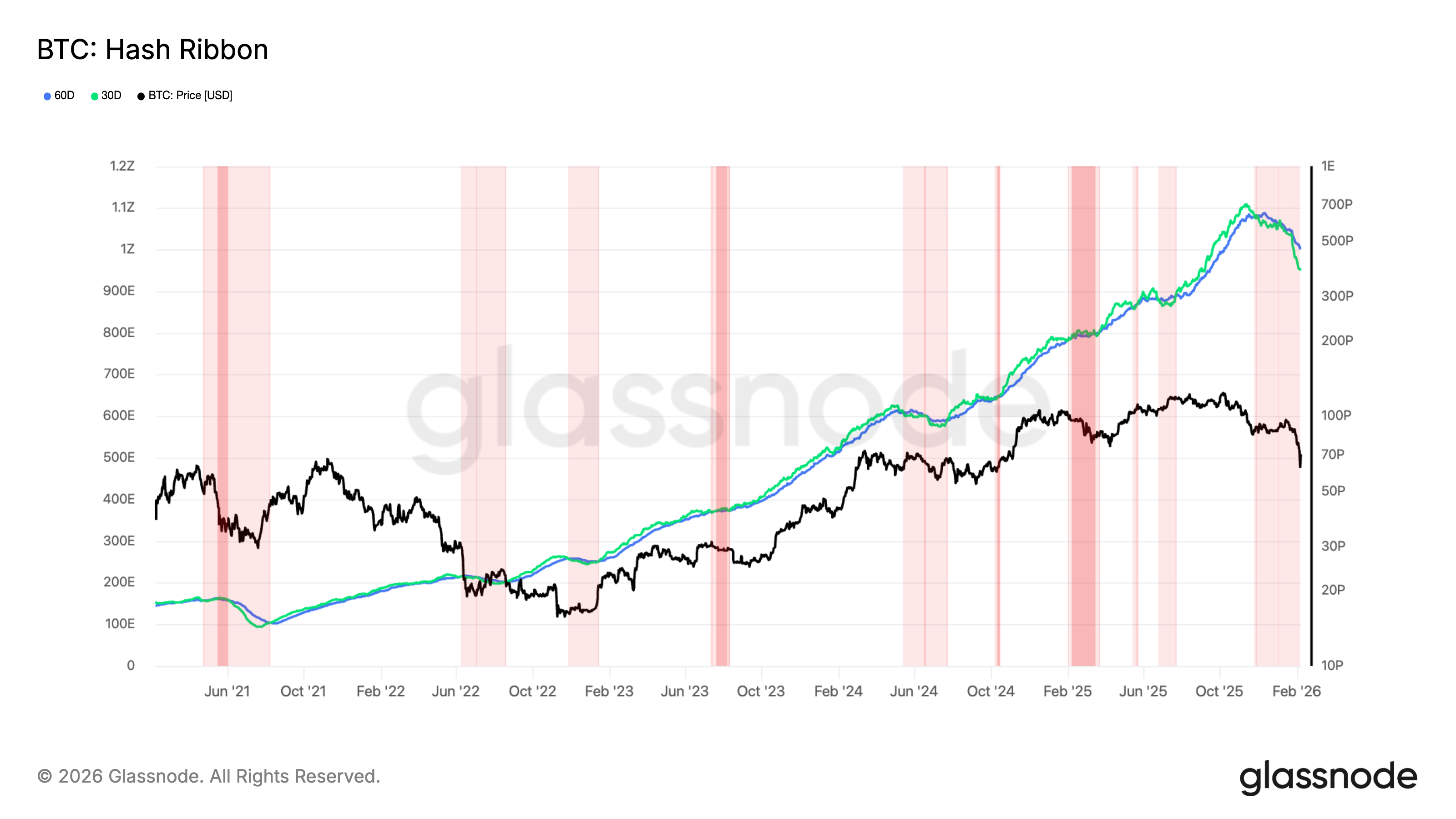 Meanwhile, the Hash Ribbons indicator also flashed a warning: the 30-day hash-rate average has slipped below the 60-day, a negative inversion that historically signals acute miner income stress and raises the risk of capitulation.