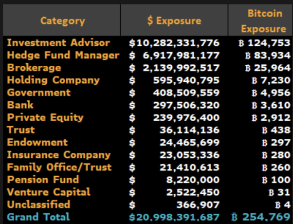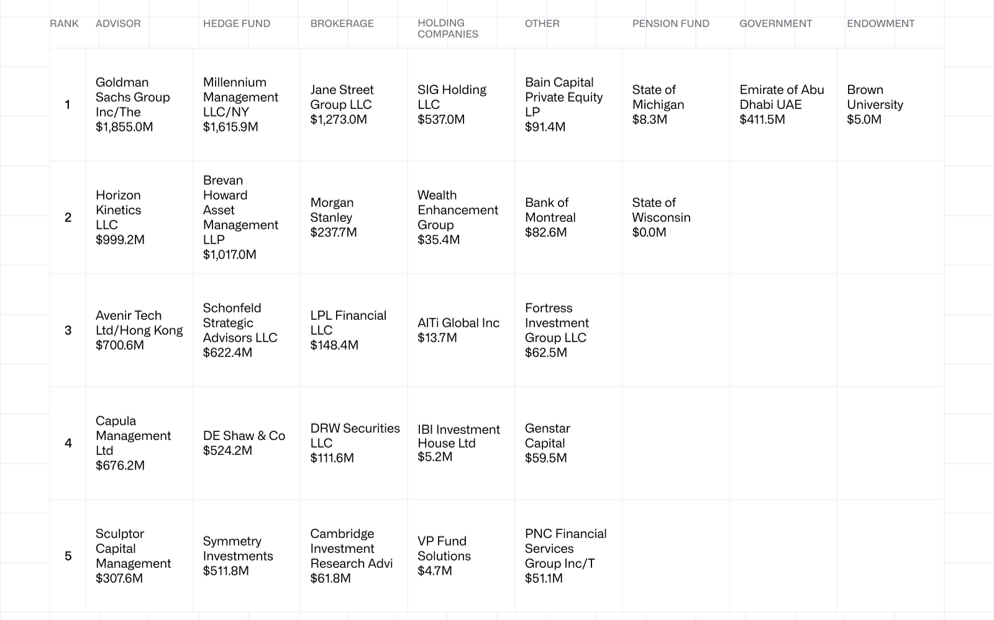 The CoinShares report adds color: Goldman Sachs leads among financial advisers with $1.8 billion invested, while Millennium Management tops hedge funds with $1.6 billion.
