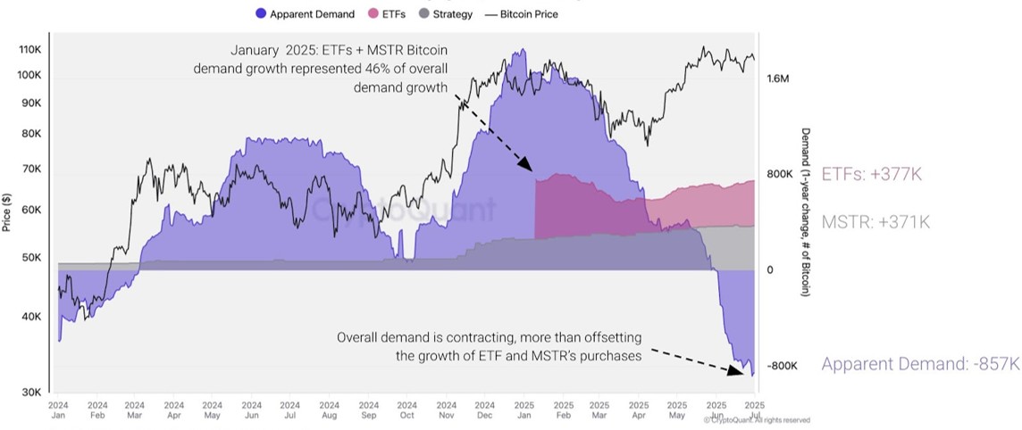 As CryptoQuant’s graph illustrates, in January 2025, Bitcoin’s apparent demand peaked around $1.6 million, double the combined ETF and Strategy inflows. Today, with ETF flows steady, that figure has flipped to negative territory, plunging to -$857,000.