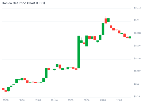 Hosico Cat has surged 43.7% in the last 24 hours, trading at $0.02769 from a low of $0.01889. The meme coin has shown a strong surge over a longer timeframe, climbing close to 82% in the last 30 days.