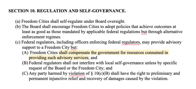 “That is not to say that all the usual regulations would apply in Freedom Cities; investors don’t like red tape, either. The goal is not getting rid of all regulation but rather finding new and better ways to guide investment, construction and business.”