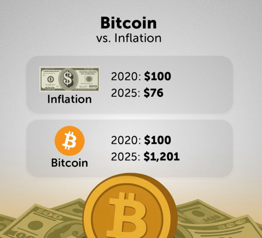 One Bitcoin investor, using the name Carl Menger, shared a comparison that got attention. According to his data, if someone held $100 in cash from 2020 to 2025, its buying power would shrink to just $76. But that same $100 put into Bitcoin would grow to $1,201 over the same stretch of time.