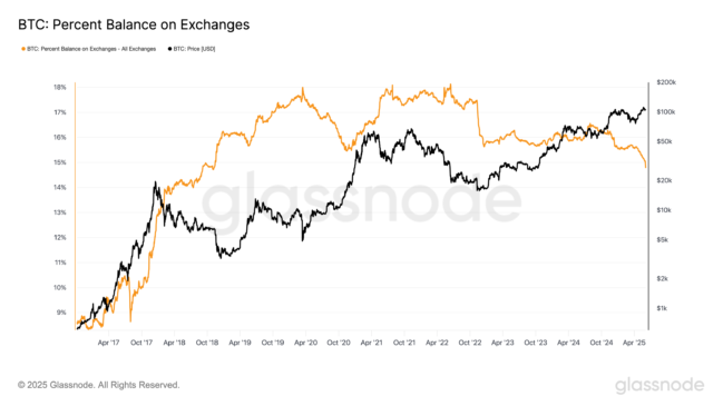 Bitcoin’s percent supply on exchanges has dropped below 11% for the first time since 2018.