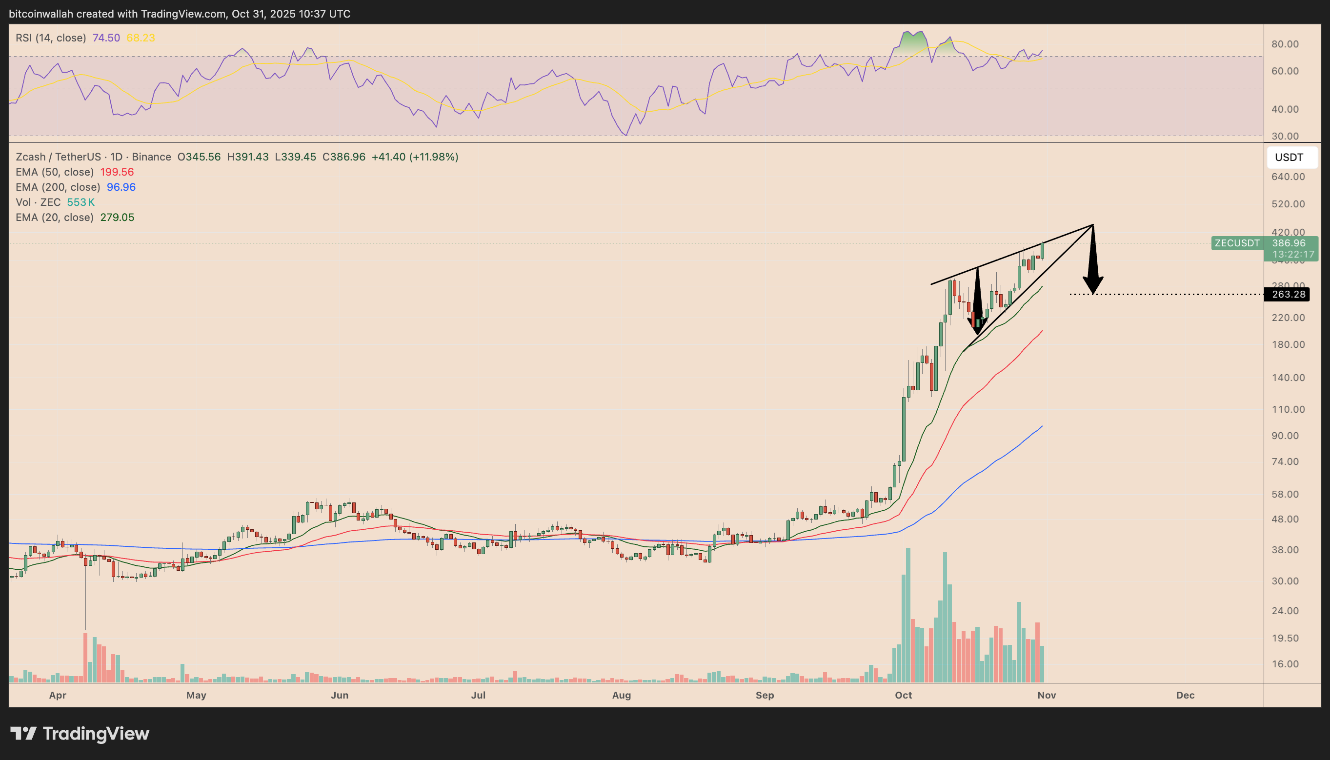 The pattern could confirm a 30% drop toward the $260–$270 area in November if sellers push ZEC below the wedge’s lower trendline.