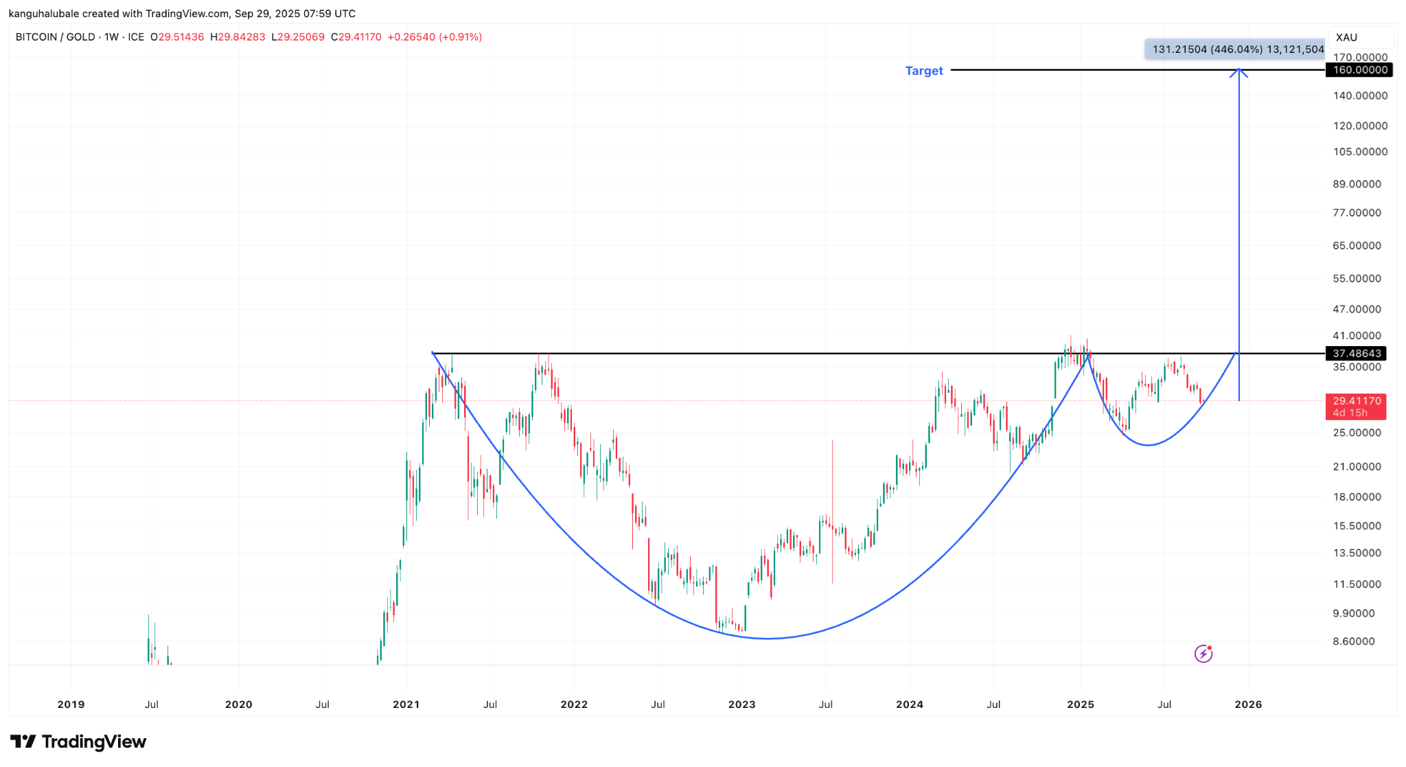 A break above the neckline at 37 XAU opens the way for the BTC/XAU pair to rally 446% toward the measured target of the cup-and-handle pattern at 160 XAU.