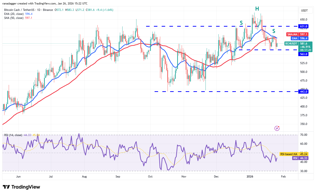 Bitcoin Cash (BCH) turned down sharply from the 20-day EMA ($596) on Sunday, but a minor positive is that the bulls held the $563 level.