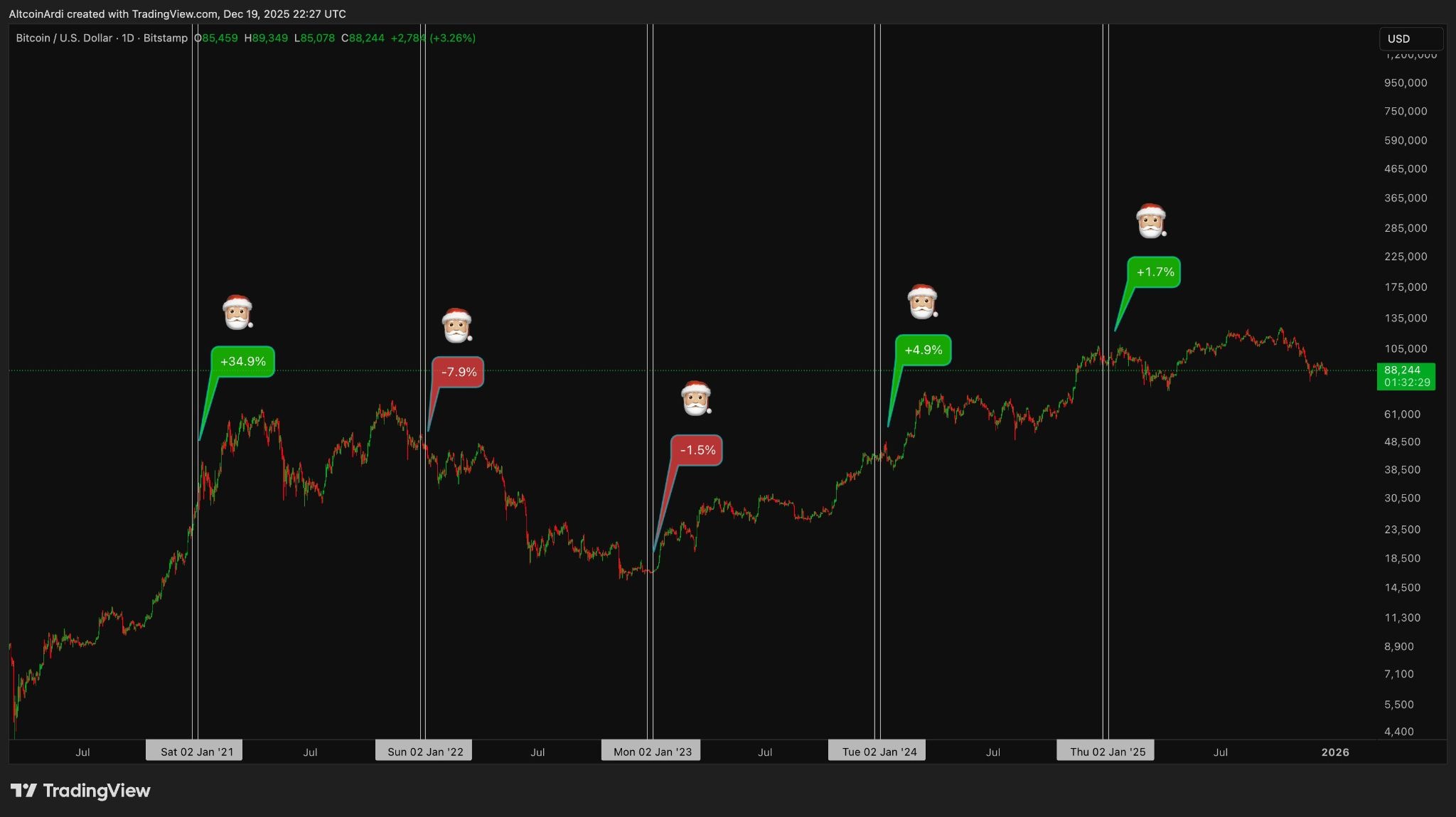 Tracking the “Santa rally” window (Dec 24 – Jan 2) over the last five years, Ardi said Bitcoin has been posting “diminishing returns and actual sell pressure,” with +34.5% gains in 2020 being an outlier.