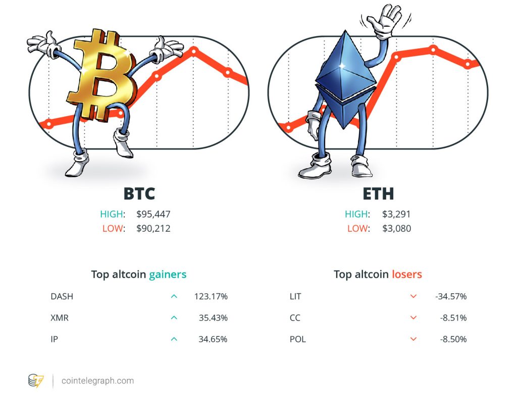 At the end of the week, Bitcoin (BTC) is at $95,447, Ether (ETH) at $3,291 and XRP at $2.06. The total market cap is at $3.23 trillion, according to CoinMarketCap.