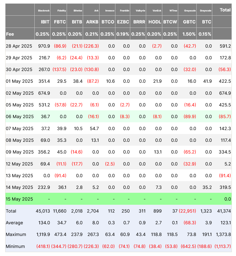 IBIT’s impressive 20-day streak of net inflows came to an end the day before — May 13 — when it registered a “0” inflow on the day. The BlackRock-issued Bitcoin product still hasn’t seen an outflow since April 9 — more than five weeks ago.
