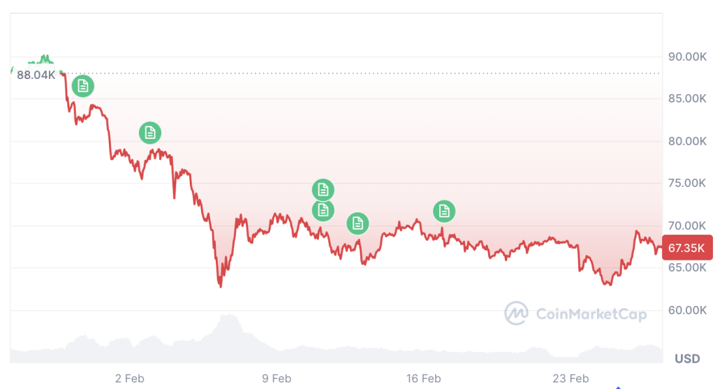 Bitcoin reached an all-time high of $126,100 on Oct. 5, only to be pushed down by a $19 billion crypto market liquidation event just days later on Oct. 10. It hit a multi-year low of $60,000 on Feb. 6 before edging slightly higher to $67,382 at the time of publication.