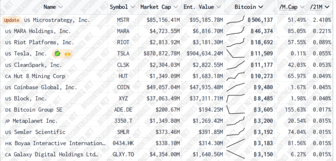 Largest corporate Bitcoin holdings. Source: BitcoinTreasuries.NET