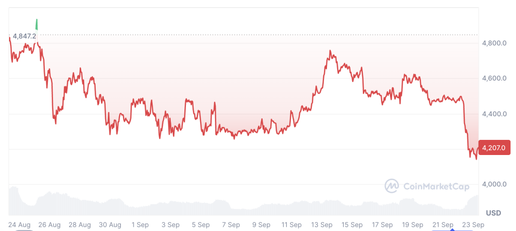 “The next resistance sits around $4,650-$4,700; a break there could quickly open the way toward $5,000,” tells Magazine. Ether trades around $4,207 at the time of publication.