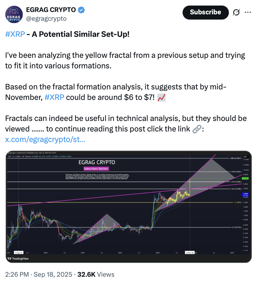 Some analysts are super bullish on the asset heading into the end of the year. Crypto analyst Egrag Crypto recently said, “Based on the fractal formation analysis, it suggests that by mid-November, XRP could be around $6 to $7.”