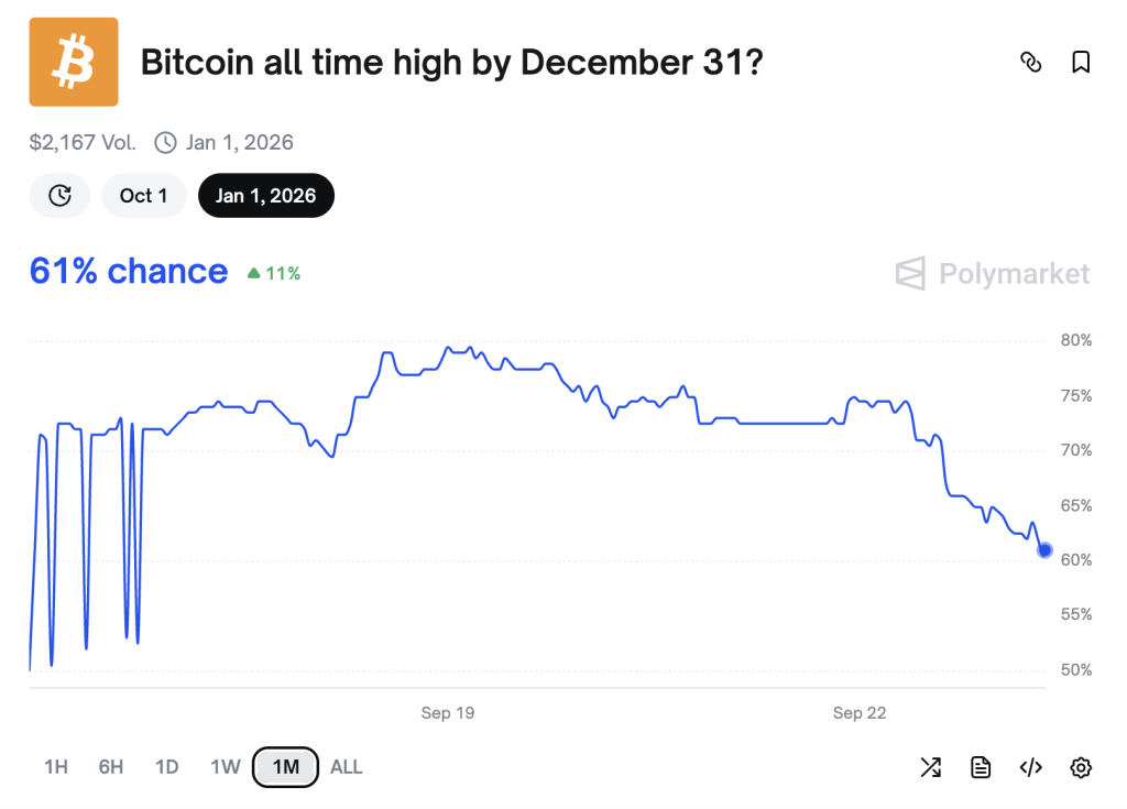 With the end of the month just a week, the odds of Bitcoin breaking its August all-time highs of $124,100 by the end of September are just 3%, according to crypto prediction platform polymarket.