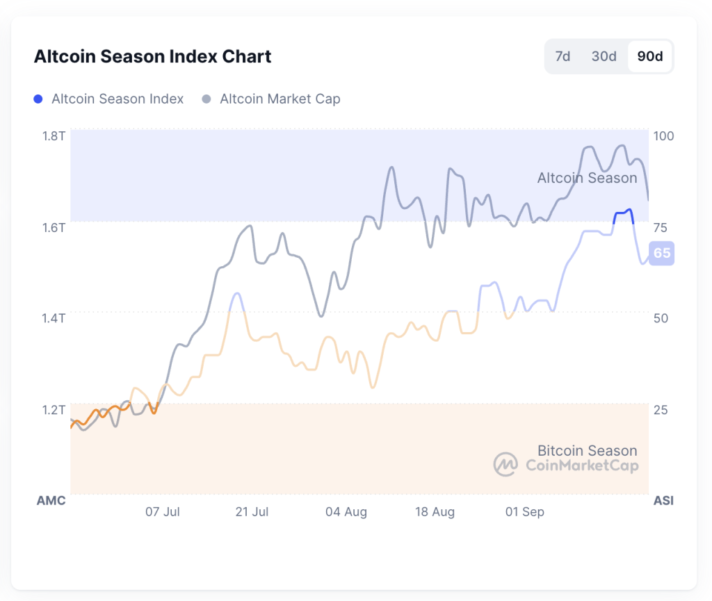The Index, which alternates between “Altcoin Season” and “Bitcoin Season” depending on how the top 100 altcoins have performed relative to Bitcoin over the past 90 days, recorded a score of 67 out of 100, indicating the market is in risk-on mode.