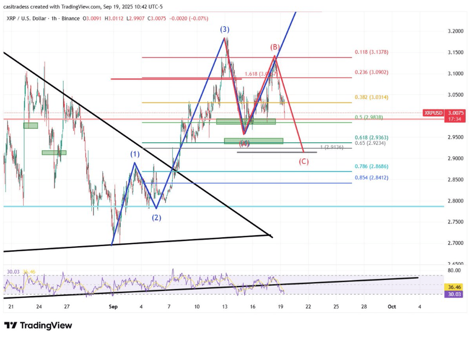 XRP has failed to maintain bullish momentum after pushing as high as $3.13 during the week. At the time of writing, XRP is trading around $3.00 and testing its resilience above this level after sliding alongside Bitcoin. The resulting price action is a defining moment for XRPโs short-term trend, according to technical analysis, and crypto analyst CasiTrades has pointed out a decisive support level that could determine whether the bullish structure remains intact.
