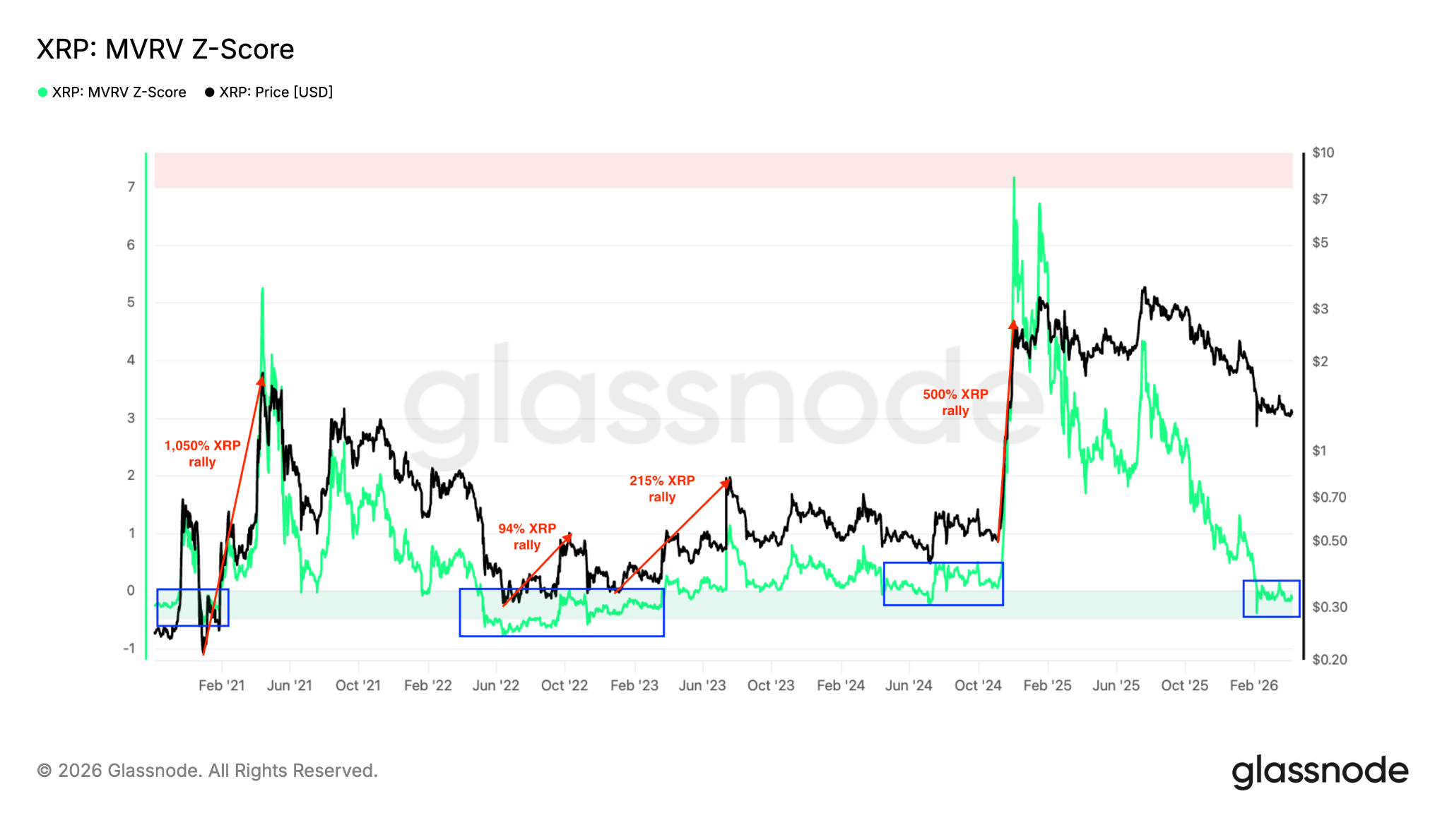 XRPโs MVRV Z-score is hovering near zero, a level that historically aligns with accumulation zones and market bottoms.
