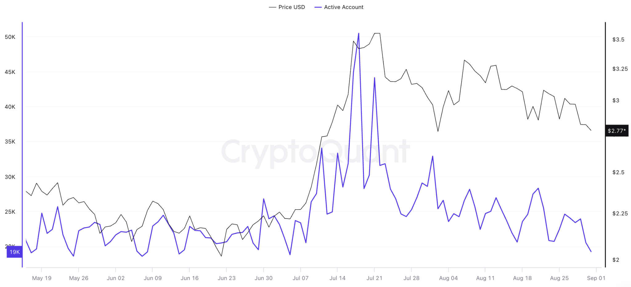 This fear is reflected in declining onchain activity, with the number of active addresses having plummeted over the last few weeks, to approximately 19,250 on Monday from $50,000 in mid-July.