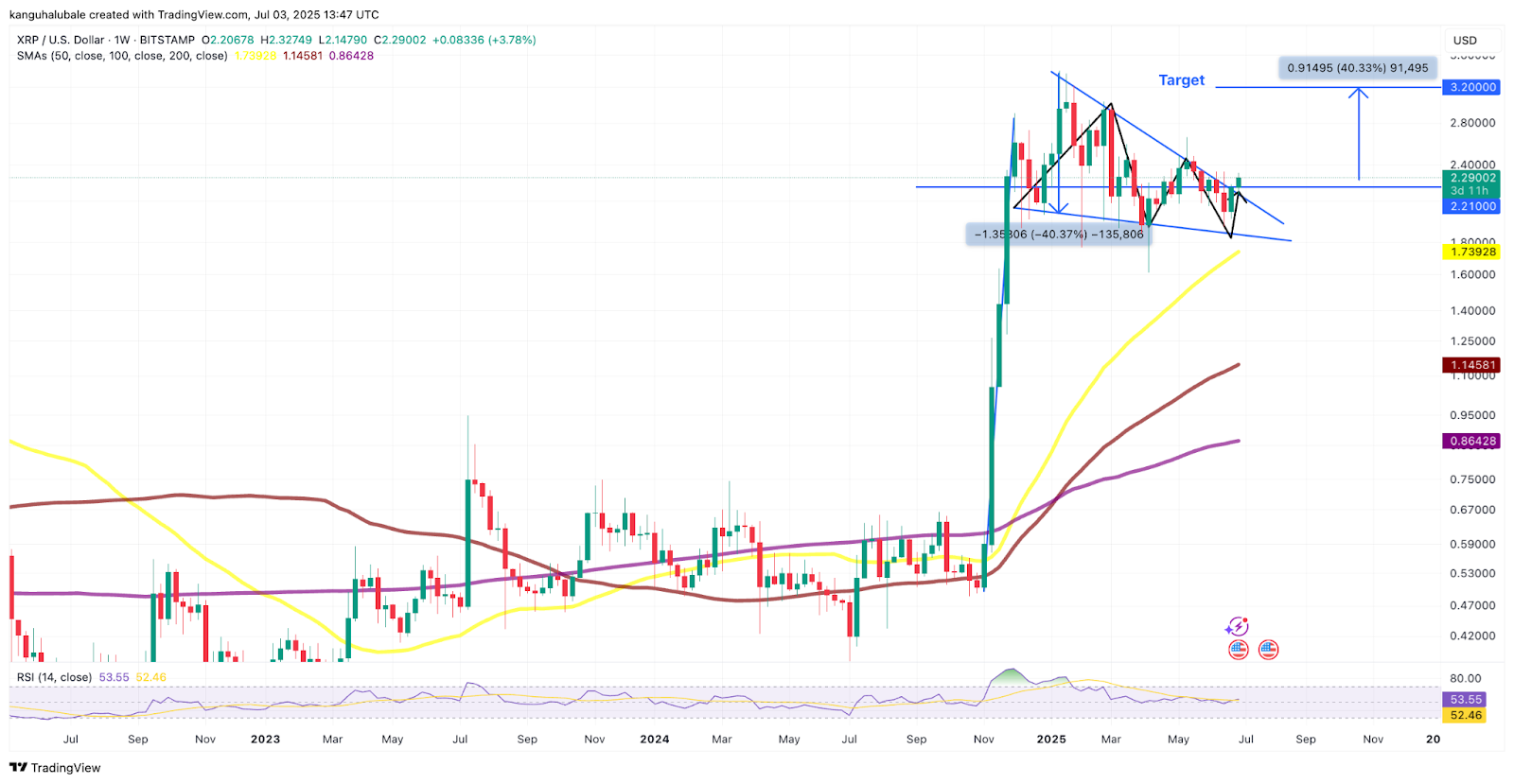 XRP’s price action between December 2024 and July 2025 has led to the formation of a pennant on the weekly chart, as shown in the figure below. The price broke above the pennant’s descending trendline at $2.21 on July 3, signaling the start of a significant upward move.