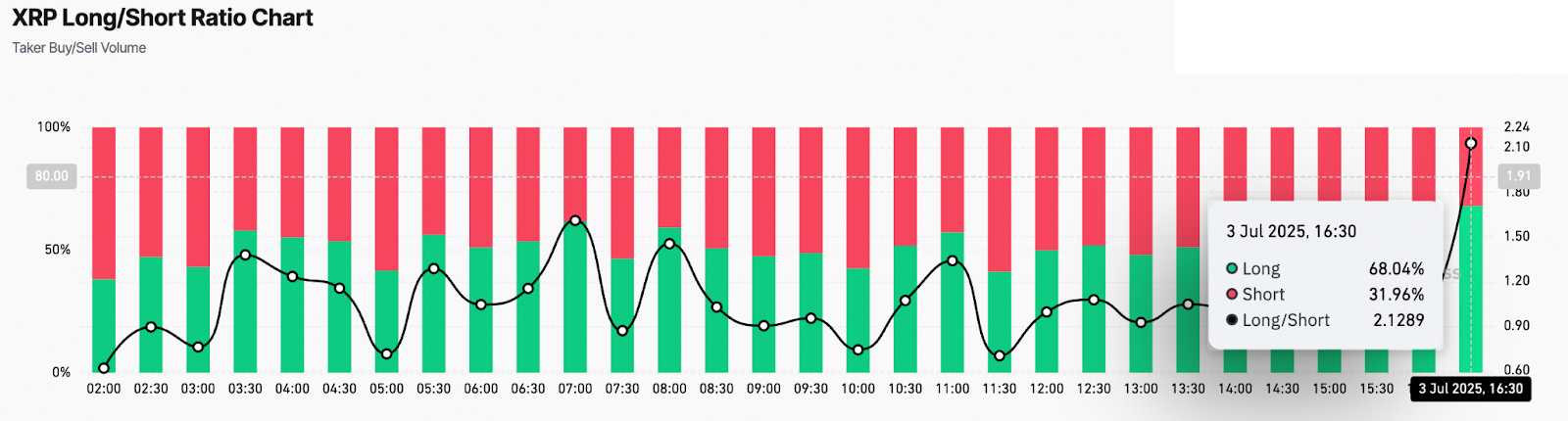 Meanwhile, XRP’s long/short ratio across all exchanges is currently skewed toward bullish positions at 68%. While this introduces long liquidation risk, it underscores rising confidence in XRP’s upside potential.