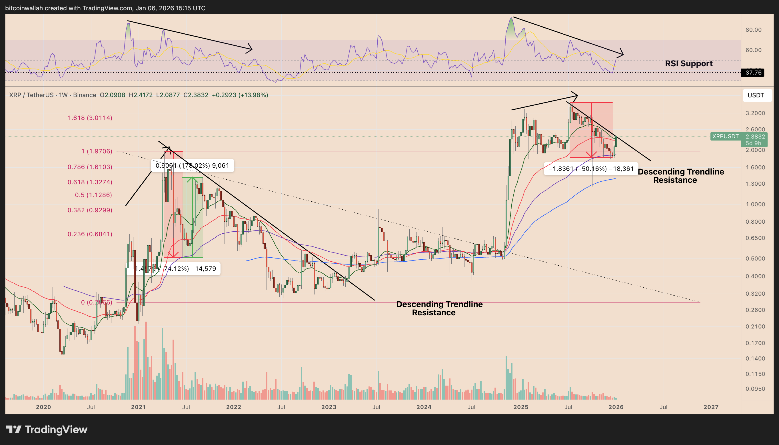 In 2026, XRP continued to trade below both the descending trendline and the 100-week EMA, suggesting the bear market may not be fully over.