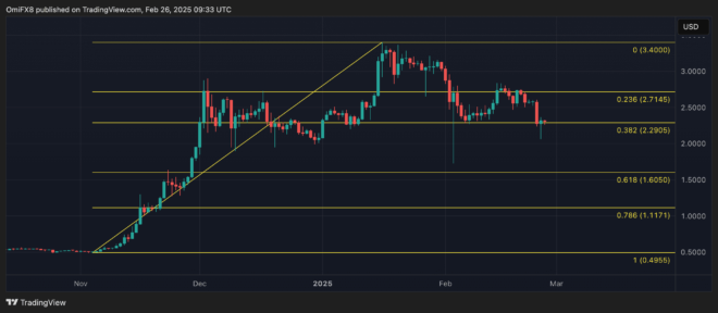 XRP reached a peak of $3.40 in mid-January and has since entered a downtrend, with the price dropping 25% this month to $2.28, according to data from TradingView and CoinDesk.