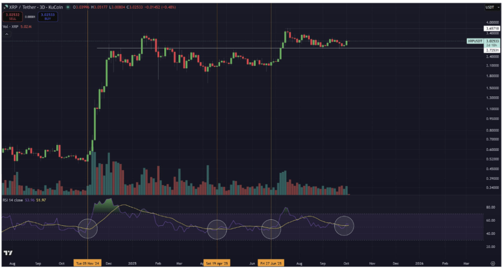 The RSI, which tracks momentum shifts in market sentiment, has just crossed above its signal line to form a bullish structure identical to those seen in November 2024, April 2025, and June 2025. Each of these past simultaneous 3-day candle closes and RSI crosses occurred shortly before major XRP rallies.