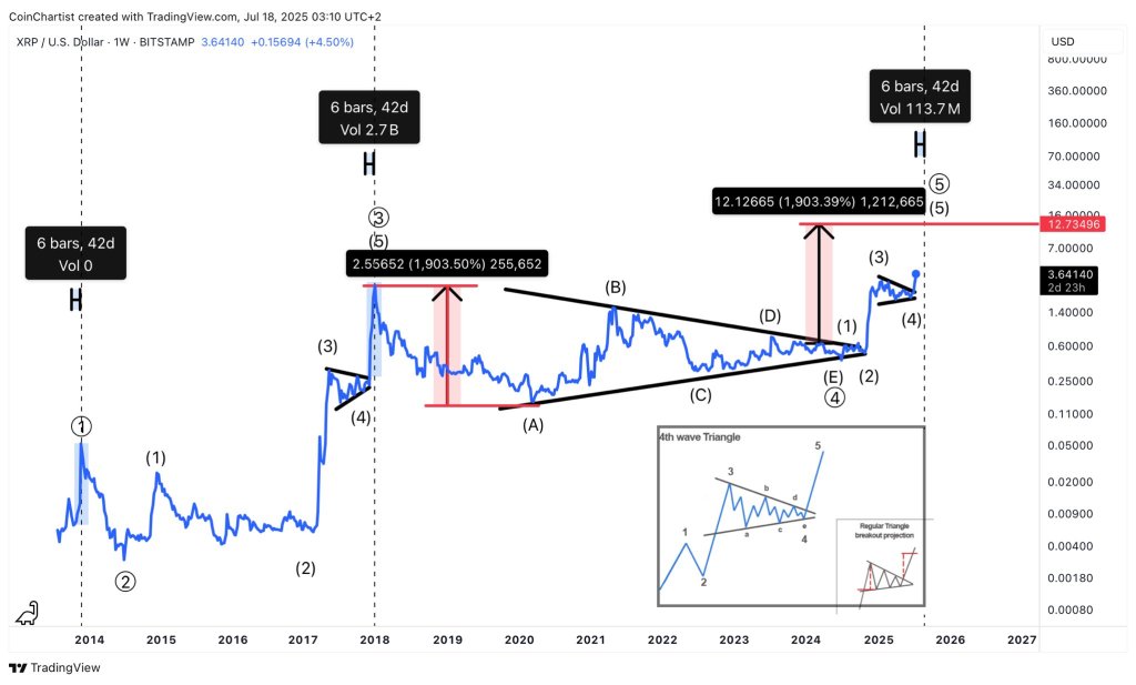 A red vertical projection equal to the 2017 percentage ascent—+1,903.39 %—is transposed from the post‑triangle base at approximately $0.64 (implicit in the $12 height of the arrow) and terminates at $12.73496, a level Severino marks in crimson across the right axis. The time analogue remains striking: a dashed line, 42 days to the right of the present bar, brackets what would be week six of the prospective surge, accompanied by a placeholder volume note of 113.7 million XRP.
