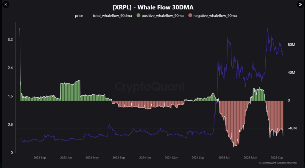 According to CryptoQuant analyst Maartunn, on average whales have been net moving about $50 million per day away from XRP holdings. That flow has coincided with renewed price weakness and sharper swings than seen in recent weeks.