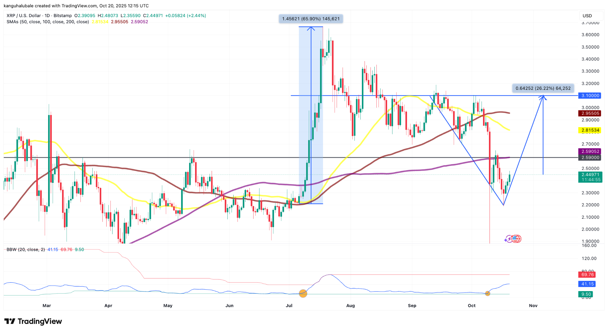 The last time the bands were this tight, it led to a 66% rebound in XRP price from its multi-year high of $3.66 from $2.20.
