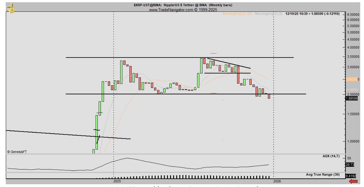XRP has lost the key levels: The psychological level at $2 and the 50-week exponential moving average (SMA) at $1.87, a signal that previously marked cycle peaks.