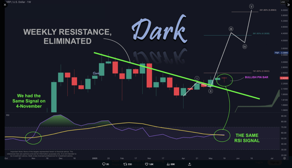 According to Dark Defender’s post on X, a golden cross formed on the weekly RSI back on November 4, 2024. That same signal came before a run from $0.5029 to $3.388. Some believe history could repeat itself this time. If traders follow the pattern, a move to $5.85 isn’t out of reach.