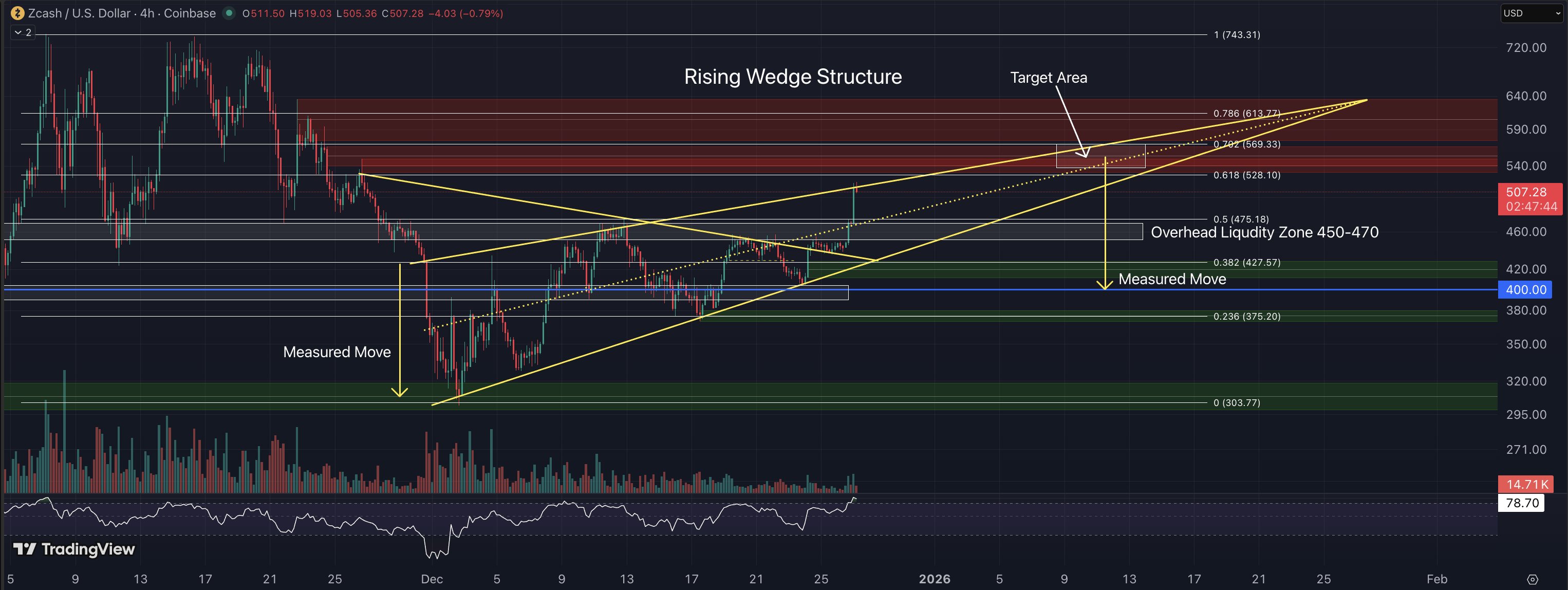Since that interview aired, ZEC has rallied roughly 40%, climbing to around $550. The move extends an 82% rebound from its local low near $300 established just a month earlier.
